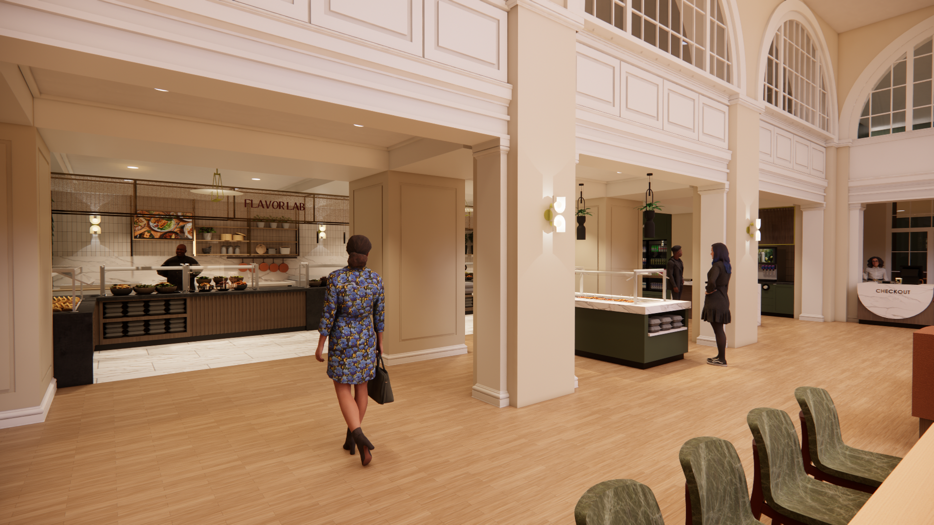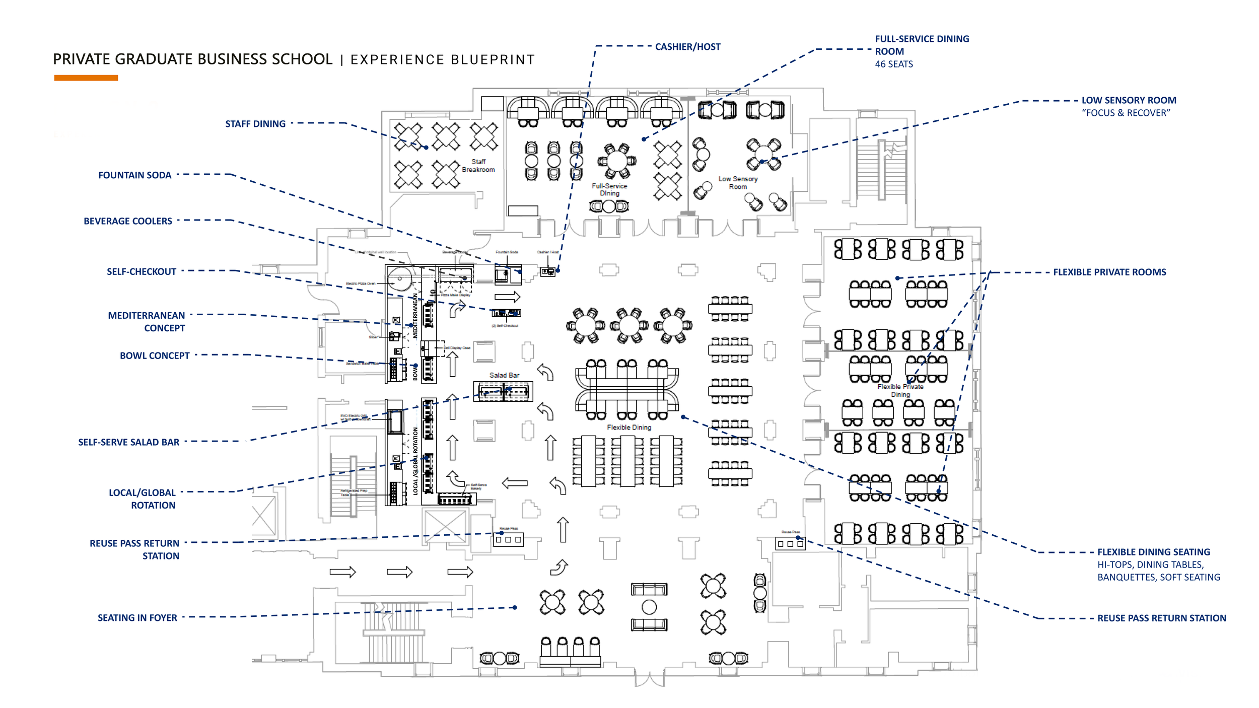 A hospitality-forward dining strategy for a private graduate business school. This strategic renovation repositions the dining hall as a central gathering hub, merging the refinement of executive dining with the warmth and flexibility of a modern campus environment. The vision supports connection, academic rhythm, and professional momentum.