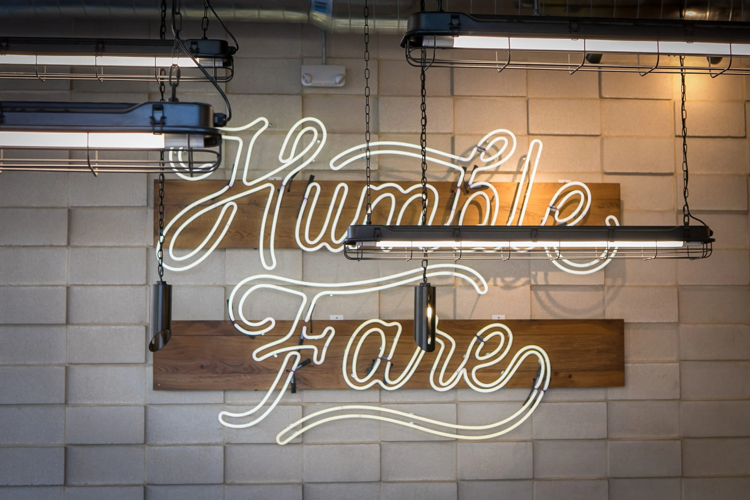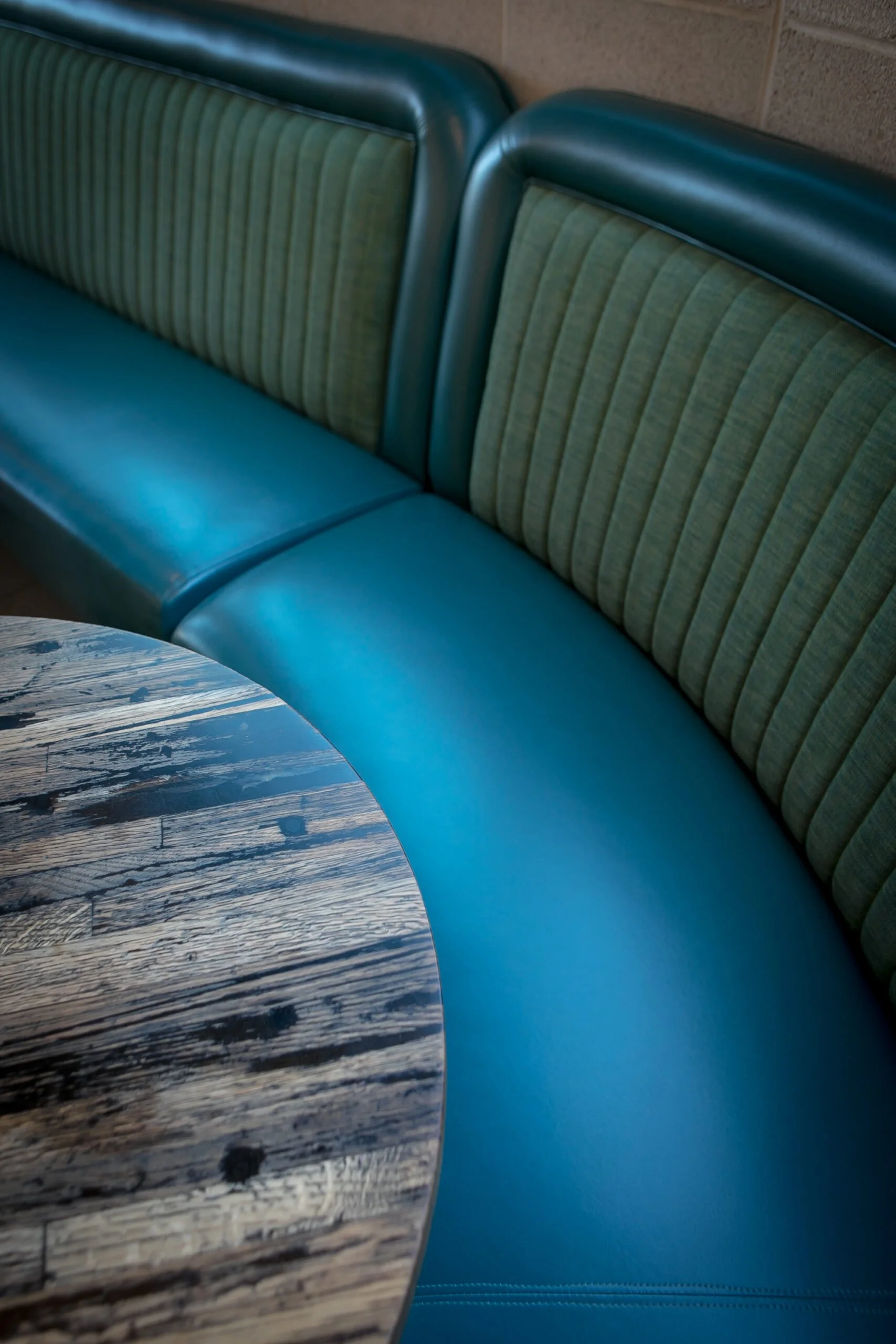 Left-behind shop fixtures were used to make light fixtures, host stands, and foot rails. Booths were modeled after retro car bench seats and tables were made from reclaimed car hoods.